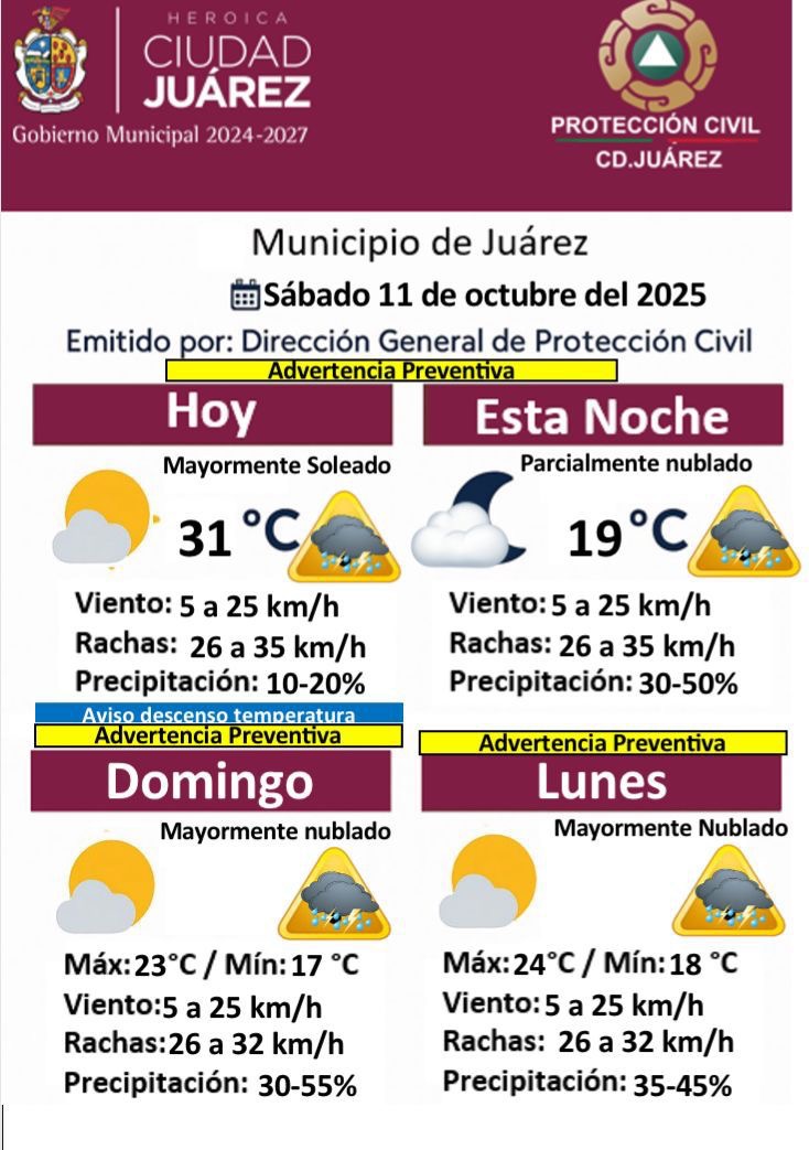 La Dirección General de Protección Civil del Municipio de Juárez emitió una advertencia preventiva para este fin de semana debido a la posibilidad de lluvias, ráfagas de viento y un descenso considerable en la temperatura.