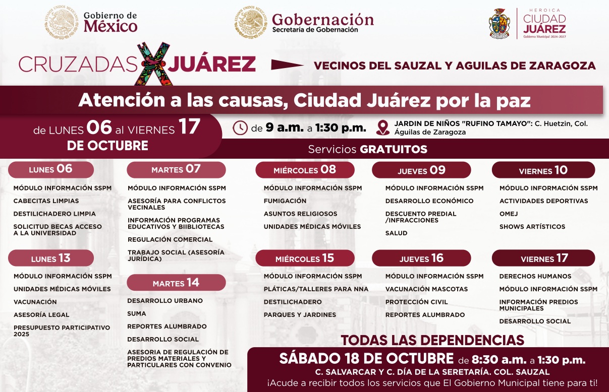 Este sábado 18 de octubre se llevará a cabo el programa “Cruzadas por Juárez, Atención a las Causas, Ciudad Juárez por la Paz”, en la colonia El Sauzal, en la calle Salvarcar y Día de la Secretaría, de 8:30 de la mañana a 1:30 de la tarde.
