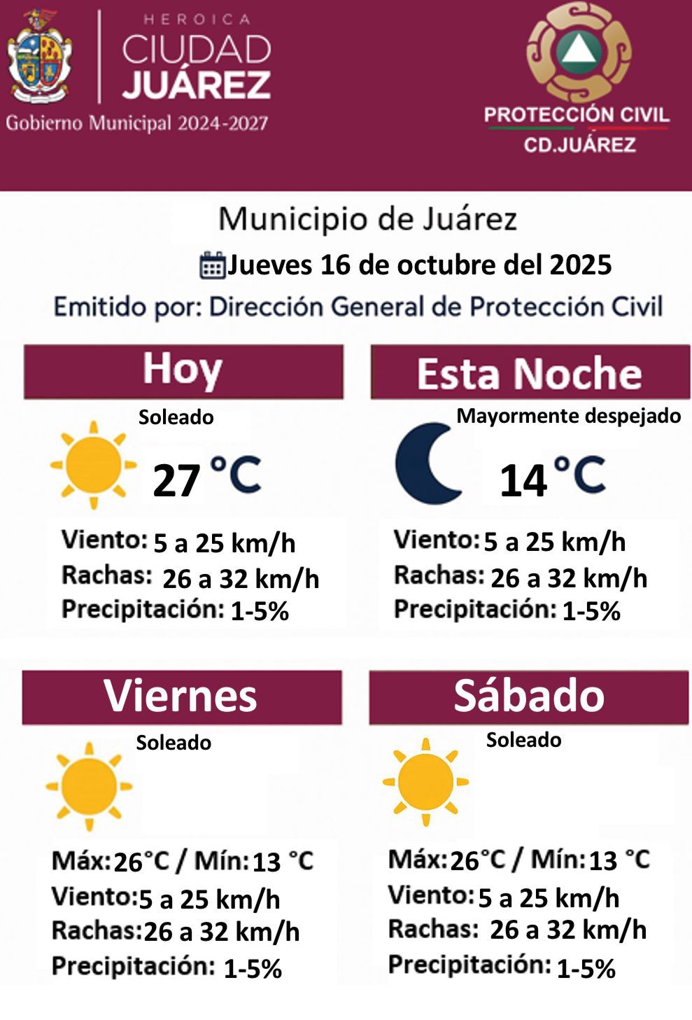 La Dirección General de Protección Civil informó que para este jueves 16 de octubre se espera un clima mayormente soleado en la ciudad, con una temperatura máxima de 27 grados centígrados y mínima de 14 durante la noche.