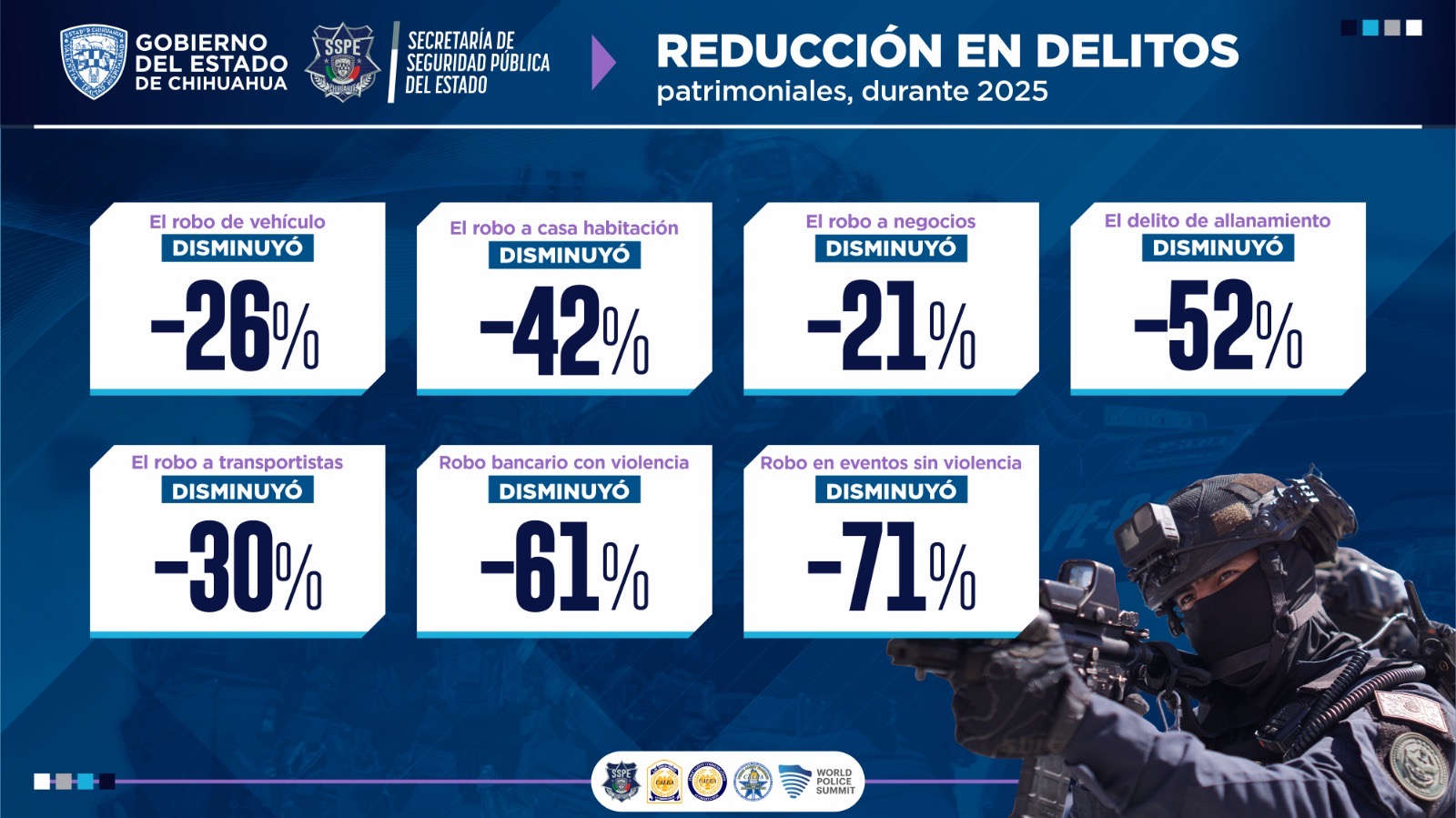 La Secretaría de Seguridad Pública del Estado (SSPE), reitera su compromiso con la ciudadanía para recuperar y mantener la tranquilidad y la paz en Chihuahua, es por ello que durante el 2025, las estrategias implementadas por el titular de la SSPE, permitieron alcanzar una serie de resultados favorables en materia de seguridad.
